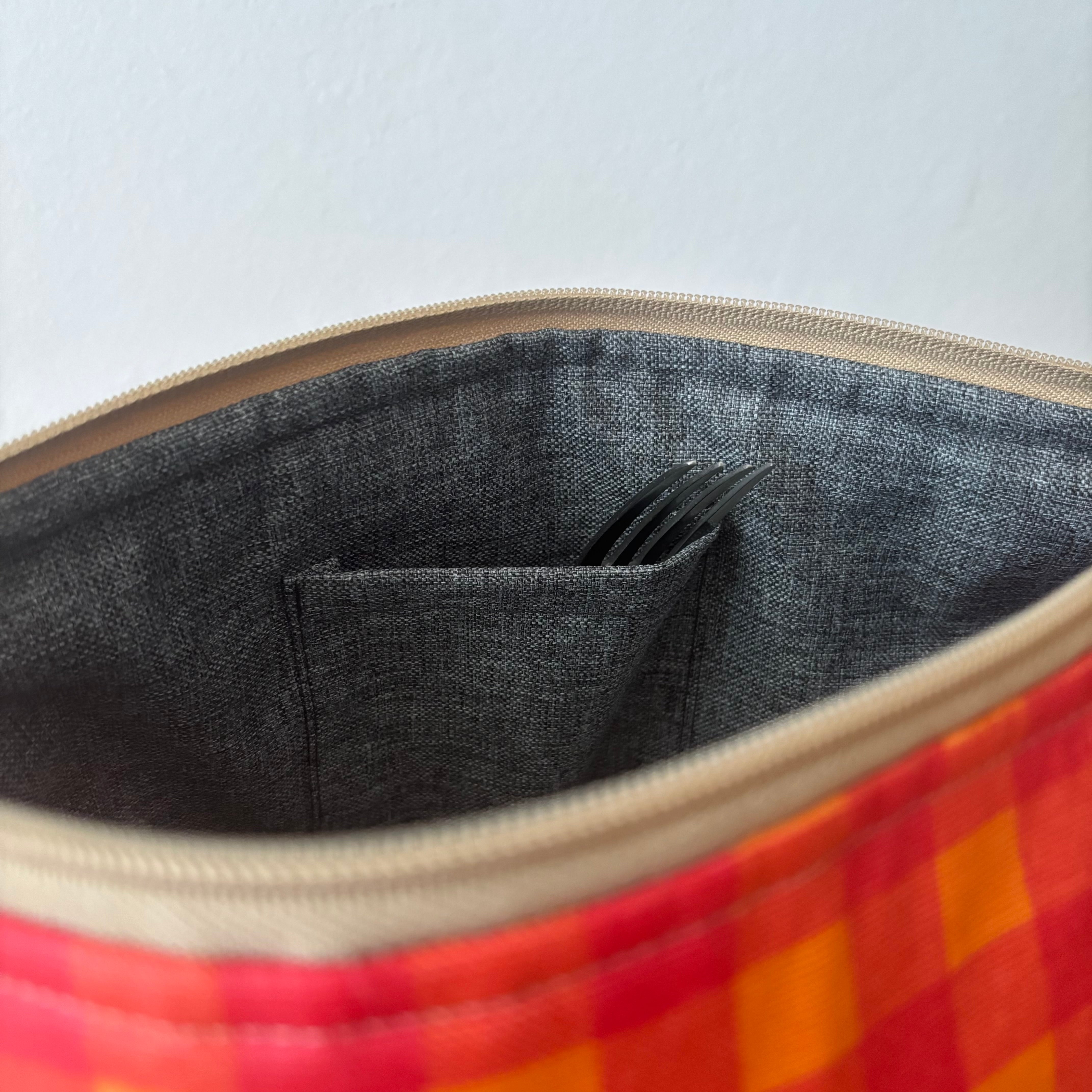 Una bolsa pensada para acompañarte todos los días: mantiene la comida a buena temperatura gracias a su interior térmico, se cierra con cremallera y tiene un bolsillo interior para guardar los cubiertos o lo que necesites tener a mano.
