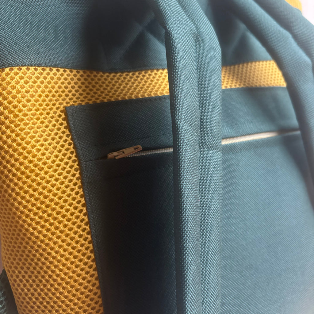 📍Bolsillo delantero con snaps y bolsillo posterior antirrobo con cremallera.